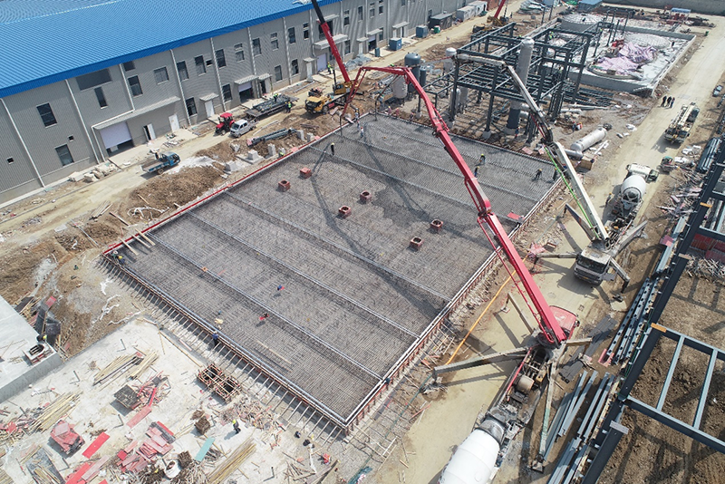 5月15日凌晨,歷經21小時,隨著最后一車混凝土通過天泵注入模板,中材鋰膜三期項目氣體回收區設備基礎澆筑順利完成,項目進度取得階段性進展,標志著除獨立的基膜車間一以外,已具備整套試生產設備安裝條件。本次澆筑的氣體回收區設備基礎一次性澆筑體積2000余立方,相較于一般的筏板基礎而言內部構造較為復雜,且有液體溝道